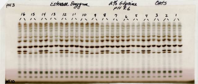 To determine if the same esterase band can be used to distinguish naked oats and covered oats, 16 randomly selected naked genotypes and 16 randomly selected covered genotypes were examined. The results (Fig. 2) showed that the diagnostic band was consistently present in all of the naked lines and was consistently absent in all of the covered lines. These results suggested that the esterase isozyme was tightly linked to at least one of the genes (presumably N-1) conditioning nakedness in oats. Preliminary studies on the inheritance of the isozyme marker have suggested that it is inherited as a complex factor. These studies are continuing at the present time. Additional studies examining the effects of environmental factors on the expression of the marker are planned.