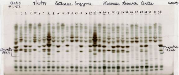 Fig. 2. Esterase banding patterns of 16 random samples of naked oats and 16 random samples of covered oats. Sample nos. 1 - 8 and 17 – 24, inclusive were naked, and samples 9 – 16 and 25 – 32, inclusive, were covered. Sample #6 (LAO-586-NZ-0268, a covered genotype) and sample # 28 (OT900, a naked genotype) were loaded in the wrong lane on the gel, but their banding patterns were consistent with those expected for a covered and a naked genotype, respectively.